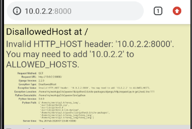 우리의 에뮬레이터는 10.0.2.2 IP를 갖고 있는데 장고 서버로 접속을 시도하다가 제한에 걸려 발생한 에러 입니다.