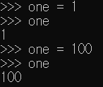 one이라는 변수에 처음에는 1 값을 대입하면 1 값이 저장되고, 100 값을 대입했더니 100이라는 값이 저장되었습니다.