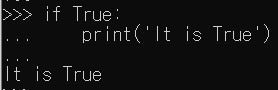 위의 코들 보시게 되면 if 문 뒤에 특정한 식이 오고 이 식이 참일 때 (현재는 무조건 참으로 작성) 다음 행동을 하게 됩니다. 지금은 참 조건이기 때문에 It is True라는 문자열이 출력이 되었습니다.