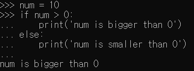 num이라는 변수에 10을 대입했습니다. 조건문을 사용하여 num 값이 0 보다 큰 경우에는 'num is bigger than 0'이 출력이 되고 0보다 작은 경우는 'num i smaller than 0'이 출력이 됩니다.