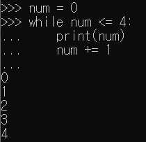 위의 예제는 4보다 작거나 같은 경우에만 출력이 되고 num 값이 5가 되는 순간 반복문을 벗어납니다.