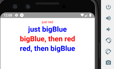 <Text style={[styles.red, styles.bigBlue]}>red, then bigBlue</Text>