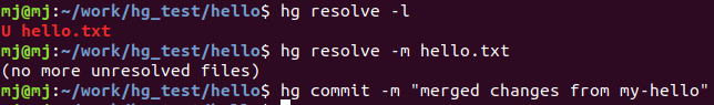 파일을 수정했다면 hg reolve -m [파일명] 명령어로 해결했다고 알려줍니다. (m옵션은 해결이 되었다는 옵션입니다)