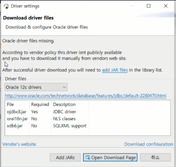 xdb6.jar / orai18n.jar /ojdbc6.jar를 모두 다운로드를 해주세요.