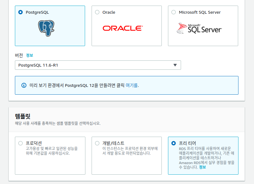 저는 postgreSQL을 사용하겠습니다. 그리고 프리티어를 체크해주세요.