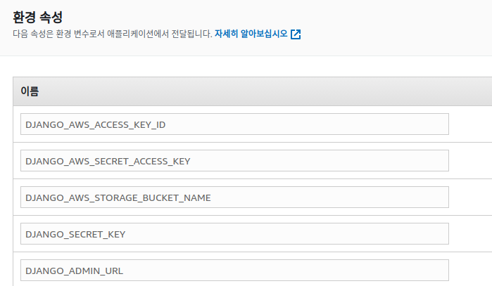 지금은 장고 비밀 키 값만 추가를 했는데 settings에 있는 디폴트 값이 없는 DJANGO_AWS_ACCESS_KEY_ID, DJANGO_AWS_SECRET_ACCESS_KEY 등등 설정 값 모두 프로퍼티에 추가를 하셔야 됩니다.