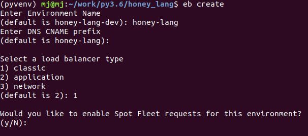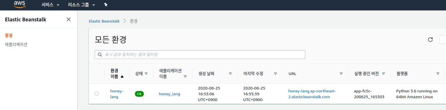 그리고 생성이 쭉 진행이 되는데, 완료가 되면 aws 사이트(elastic beanstalk 메뉴)에서 honey-lang(프로젝트 네임)이 생성된 모습을 보실 수 있습니다.