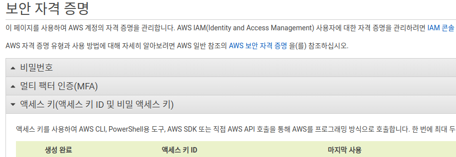 위의 사진과 같이 내 보안 자격 증명으로 이동해주세요. 다음으로 액세스 키 항목으로 이동을 해주셔야 되는데요.