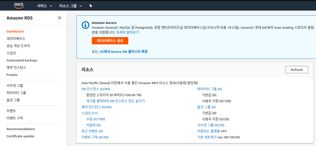 aws사이트에 접속하여 rds 메뉴로 이동해주세요.