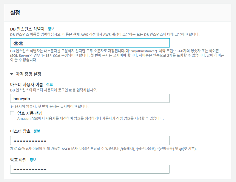 RDS_DB_USERNAME -> honeydb(사용자 이름)