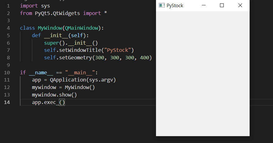QMainWindow를 상속받는 MyWindow 클래스를 만들었습니다. MyWindow는 QMainWindow의 기능들을 사용할 수 있고 타이틀과 창 크기는 원하는 값으로 변경했습니다.
