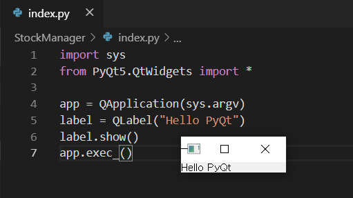 PYQT5.QtWidgets 패키지를 임포트하고 QApplication을 만들어서 레이블을 만들고 실행을 시켜주시면 됩니다.
