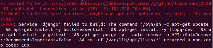 ERROR: Service 'django' failed to build: The command '/bin/sh -c apt-get update && apt-get install -y build-essential && apt-get install -y libpq-dev && apt-get install -y gettext && apt-get purge -y --auto-remove -o APT::AutoRemove::RecommendsImportant=false && rm -rf /var/lib/apt/lists/*' returned a non-zero code: 1002
