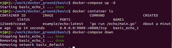 yml파일에 명시된 컨테이너들은 down 명령어를 통해서 한 번에 종료시킬 수 있습니다.
