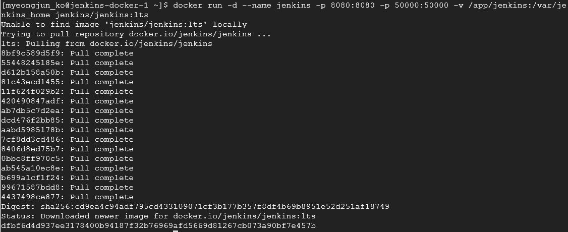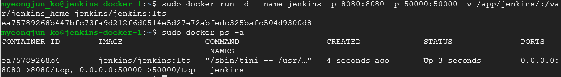docker run -d --name jenkins -p 8080:8080 -p 50000:50000 -v /app/jenkins:/var/jenkins_home jenkins/jenkins:lts