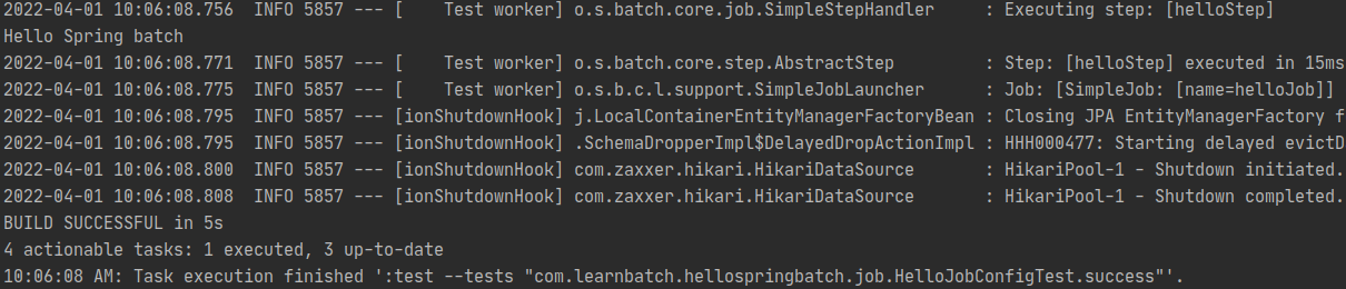 잡 런쳐는 스프링일 통해서 HelloJob 잡이 등록이 되었는데요. 혹시나 다른 Job도 여기서 한번에 테스트를 하신다고 ContextConfiguration에 여러개의 잡을 등록 하신다면 빈이 여러개 있어 에러가 발생하겠습니다.